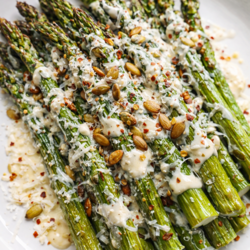 This roasted asparagus with garlicky tahini sauce is an easy, healthy side dish packed with flavor. Tender oven roasted asparagus is finished with a creamy, lemony tahini drizzle that makes this simple veggie feel elevated and restaurant-worthy.